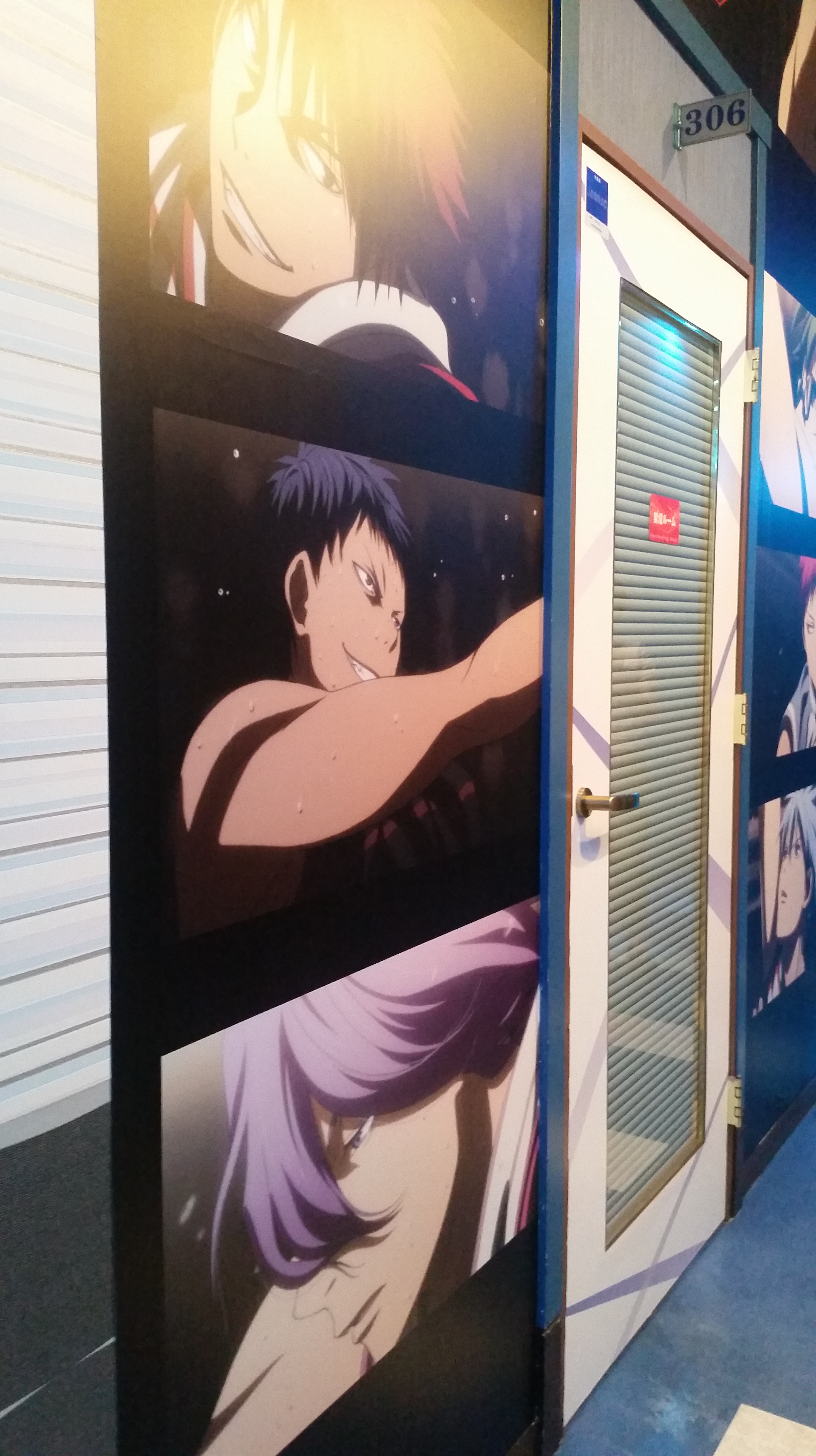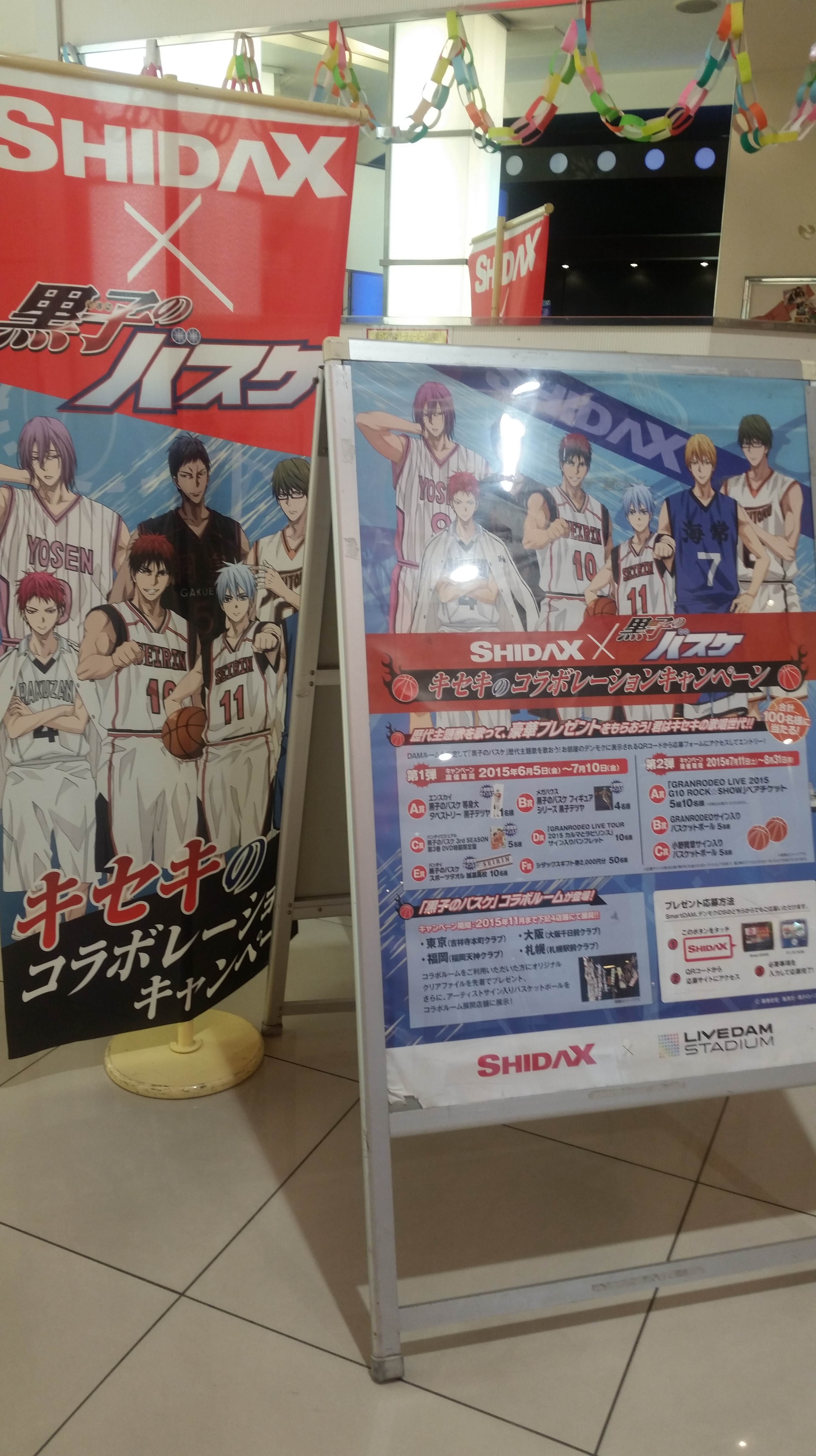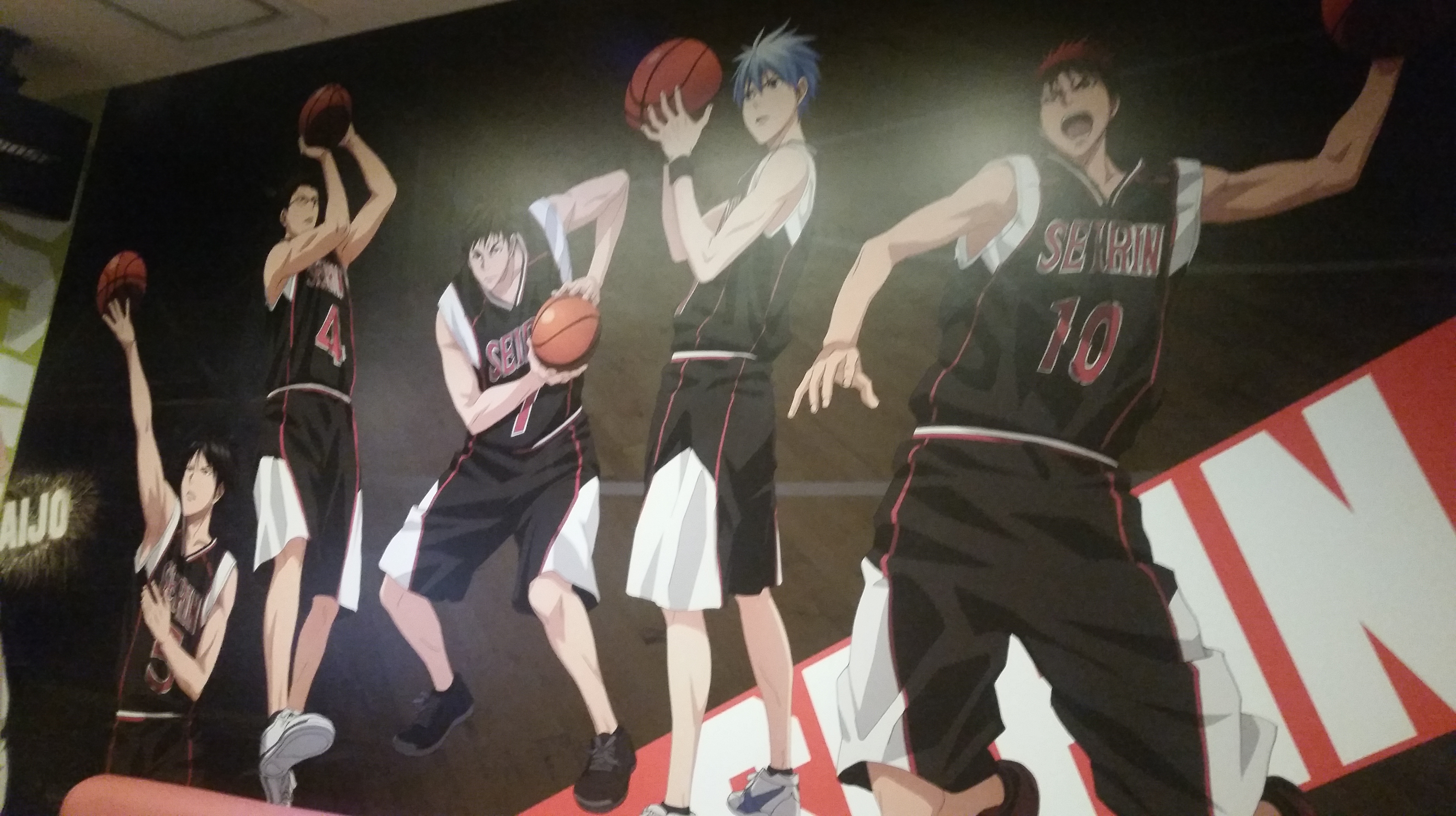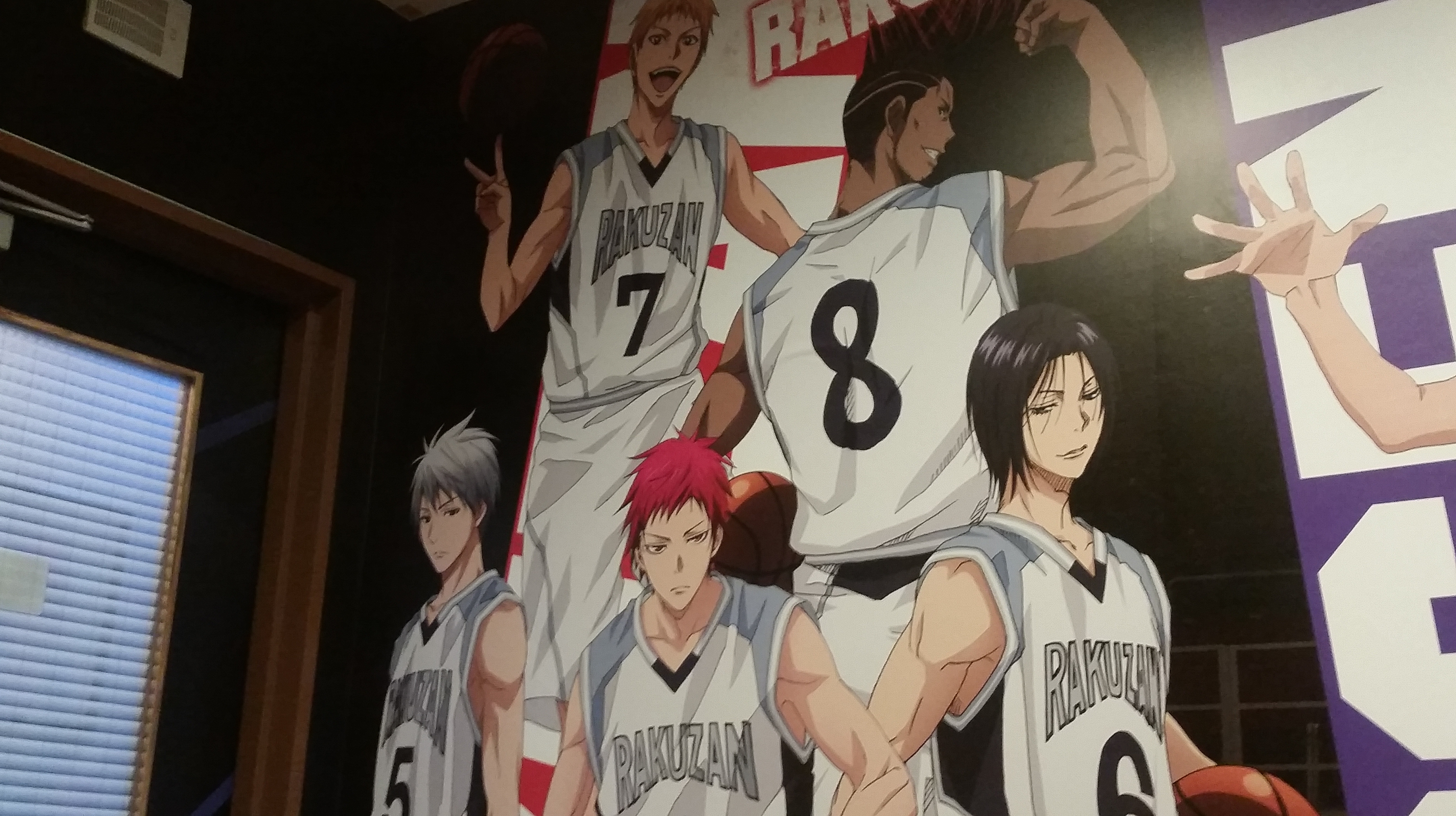 Stopped by the Shidax karaoke bar in Tenjin to try out the Kuroko no Basuke collaboration room. The door and inside were painted with characters from each of the main teams, plus, in the lobby they had one of the basketballs signed by Kiiyan and e-zuka that they’re giving away as prizes. (Click for larger images.)