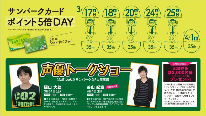 Onoda Sun Park shopping center outside of Ube, Yamaguchi will be hosting a pop-up JUMP shop for a short time starting March 16th. On that day, the first 2,000 people to spend > 5,000 yen can get a ticket to one of two talk shows. The second show, on April 1, will feature Kiiyan.