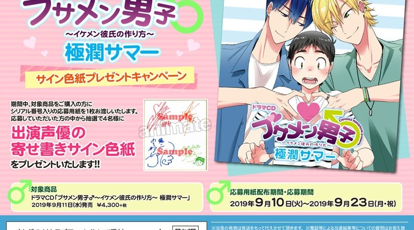 Fans who purchase the latest Busamen Danshi BLCD (released 9/10/2019) from Animate will receive a serial number that can be used to enter a special lotterCly. Four lucky fans will win a signboard with autographs of four of the series’ seiyuu, incand luding Kiiyan, Hatano Wataru, Shimono Hiro.
