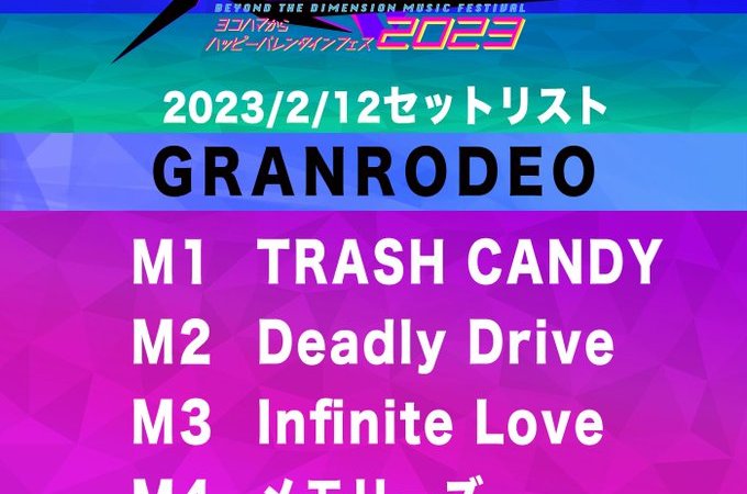 2023-02-23 Kaigai RG Odaiba Music Festival set list 💝オダイバ!! #超次元音楽祭 🍫ヨコハマからハッピーバレンタインフェス2023 #GRANRODEO のお二人ありがとうございました!熱くかっこいいステージ最高でした🎤🎸セトリ公開🔥感想は #超次元音楽祭 を入れてたくさんつぶやいてくださいね📣配信アーカイブ💻https://t.co/AMzYJpuORN pic.twitter.com/ES7zFWQBsB— 超次元音楽祭 (@Cho_jigen_Music) February 12, 2023 Share this: Click to email a link to a friend (Opens in new window) Email Click to share on X (Opens in new window) X Click to share on Facebook (Opens in new window) Facebook Like Loading... Related