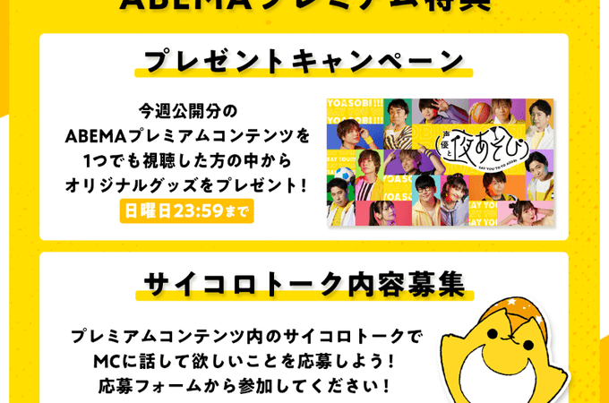2023-05-04 Kaigai RG Abema Premium Benefits #声優と夜あそび🥂✨ABEMAプレミアム特典✨4/24週のプレミアムコンテンツ配信中📺皆さまから寄せられたテーマで各曜日MCがサイコロトーク🗣トーク内容応募▷https://t.co/Vii0ptJtovプレミアムコンテンツ視聴で抽選で10名様にオリジナルグッズを🎁当選者へはABEMAギフトボックスへ連絡📩— 声優と夜あそび@ABEMA(アベマ) (@yoasobi_ABEMA) April 30, 2023 Abema is soliciting conversation topics from fans to be used in the post-show videos. Topics can be submitted here. 10 winners selected by random lottery will win premium goods. Share this: Click to email a link to a friend (Opens in new window) Email Click to share on X (Opens in new window) X Click to share on Facebook (Opens in new window) Facebook Like Loading... Related
