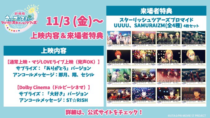 2023-11-01 Kaigai RG Star Tours Back in Theaters /11/3(金)からの上映情報ご案内✈️\劇場版 うたの☆プリンスさまっ♪マジLOVEスターリッシュツアーズ🌈マジLOVEライブ上映(発声OK)& #ドルビーシネマ 版🎁来場者特典スターリッシュツアーズブロマイドUUUU、SAMURAIZM (全4種)サプライズ&アンコールは画像をチェック✅#うたプリST pic.twitter.com/XHVagT1H2V— アニメ「うたの☆プリンスさまっ♪ マジLOVE」シリーズ公式 (@utapriMAJILOVE) October 30, 2023 Starting 11/3, the movie is back in theaters for a limited time, with cheering allowed. Share this: Email a link to a friend (Opens in new window) Email Share on X (Opens in new window) X Share on Facebook (Opens in new window) Facebook Like Loading... Related