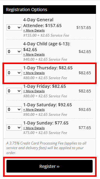 NOTE: If you do not have a credit card, you won’t be able to register in advance. You would have to register at the convention and hope that tickets for the concert are still available.