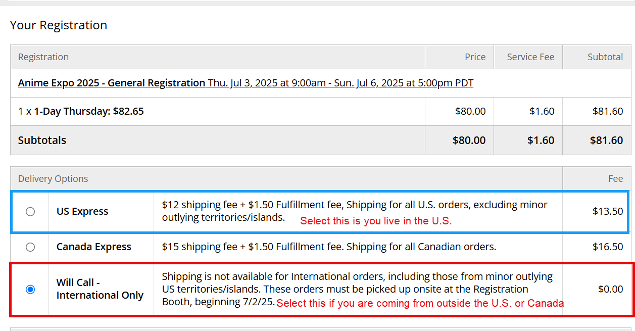 If you are in the U.S. or Canada, select the option to get your convention badge mailed to you. If you’re from anywhere else, select Will Call. You’ll need to pick your ticket up at the convention.