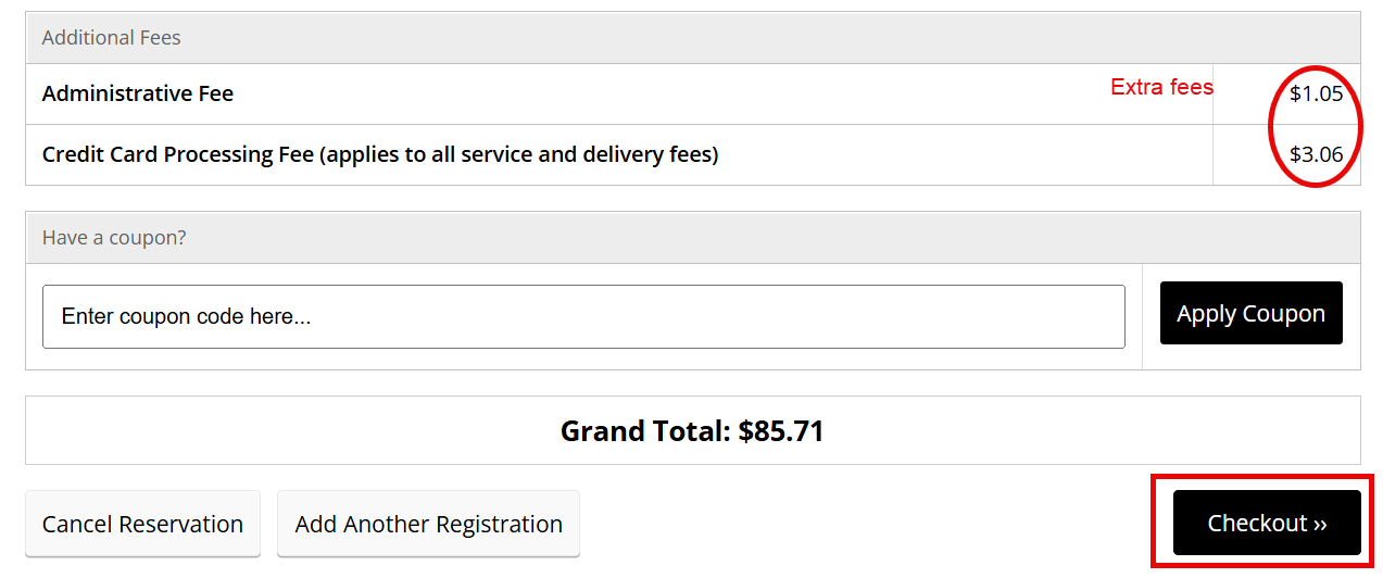 Note the extra fees and the final total, then click Checkout.