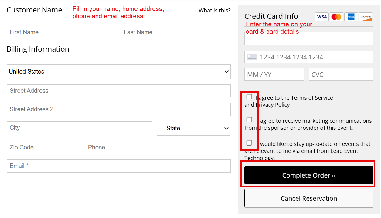 Fill in your name and billing information. Enter your credit card, check the three checkboxes, and then click Complete Order.