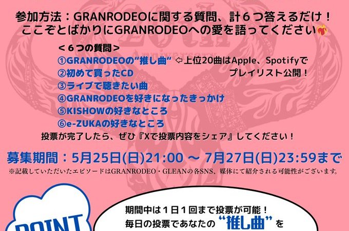 Glean staff are reaching out to Rodeo Boys and Girls to participate in the “#マイベストグランロデオ” (#my best granrodeo) campaign. They’ve posted a short survey to find out what it is fans like most about GRANRODEO.