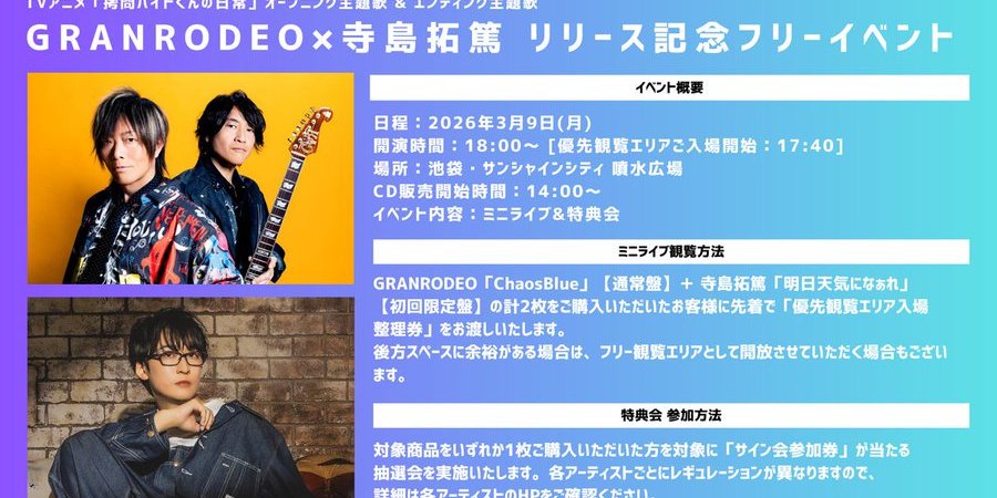 To celebrate the release of the theme songs for the TV anime “The Daily Life of a Tortured Part-Timer” — GRANRODEO’s “GO GO PARADISE!!”and Terashima Takuma’s “Ashita Tenki ni Nare” a joint release commemorative free event has been decided!