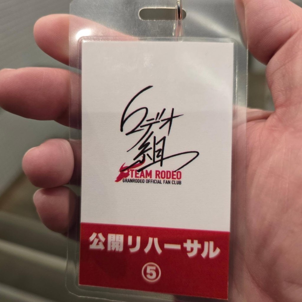 This tour the rehearsal is limited to fan club members and you can’t find out if you’re selected until a couple of hours before the show. You need to scan a QR code at the venue; the link will ask you to log into your Ro-gumi account and then displays a cute Team Rodeo-themed digital gacha machine. There’s a link beneath the gacha that you click to turn the handle. A big ? will appear and then you’ll either see the event’s downloadable digital wallpaper or you’ll get the notice about the rehearsal and a link to download the wallpaper. There are up to 20 winners.